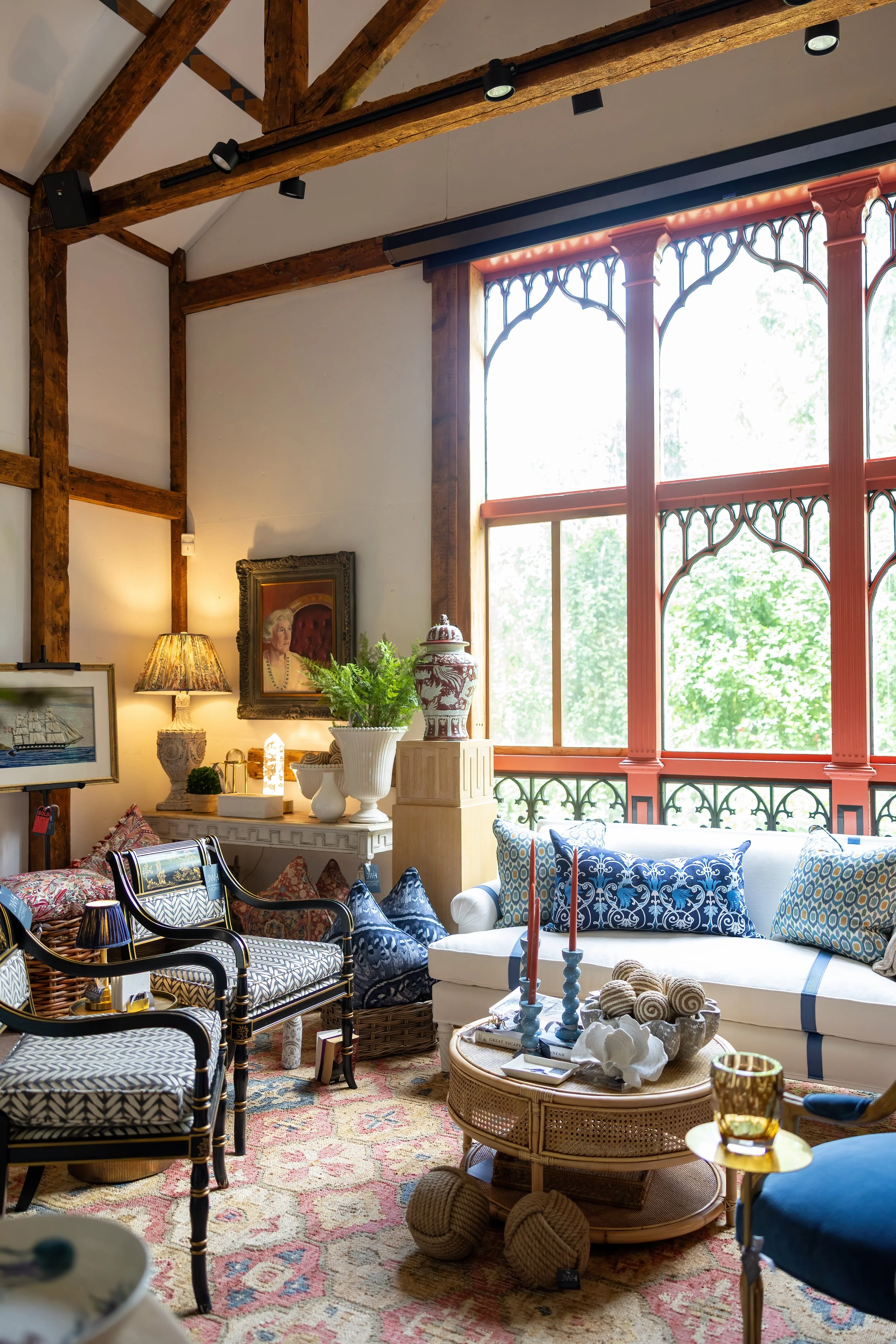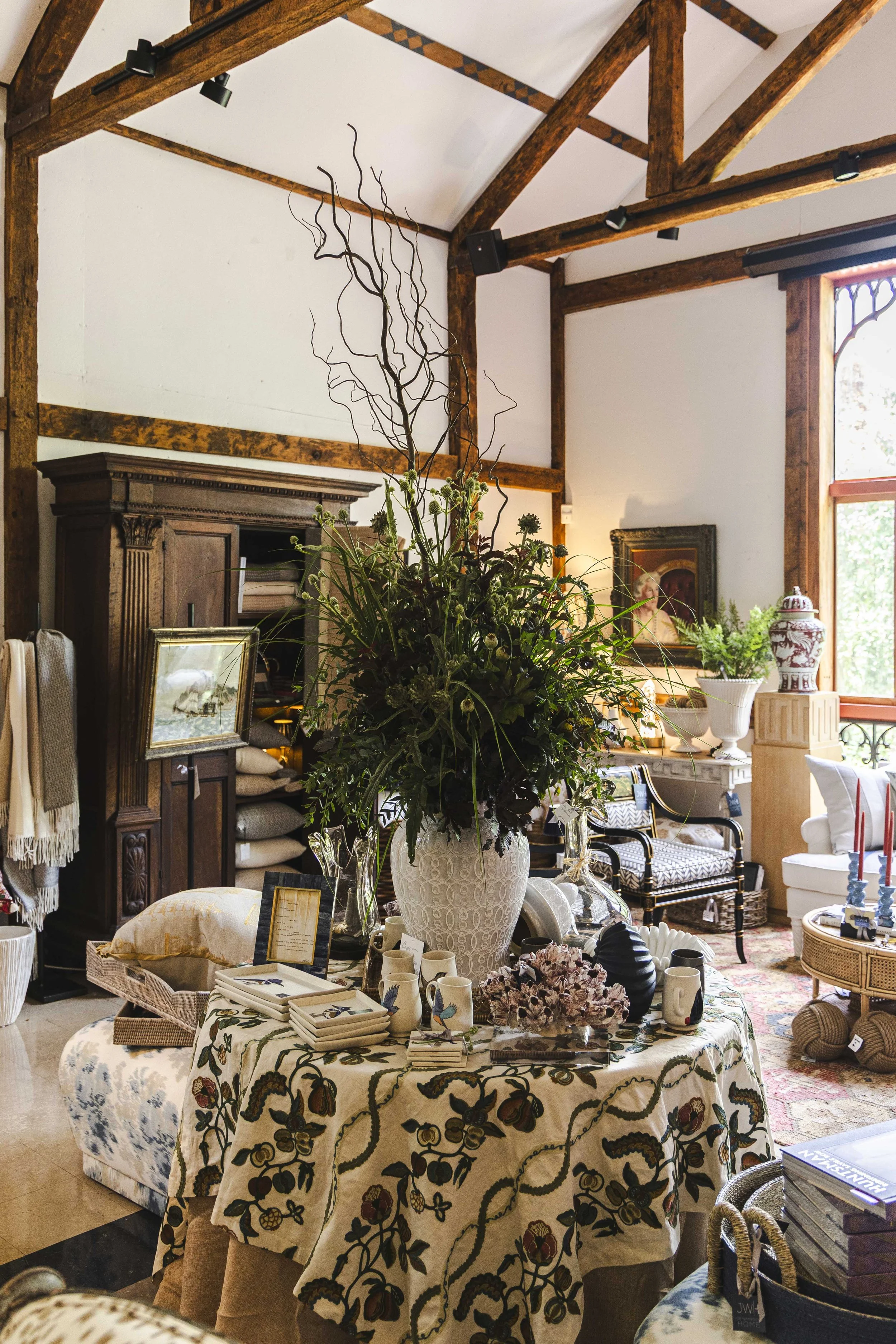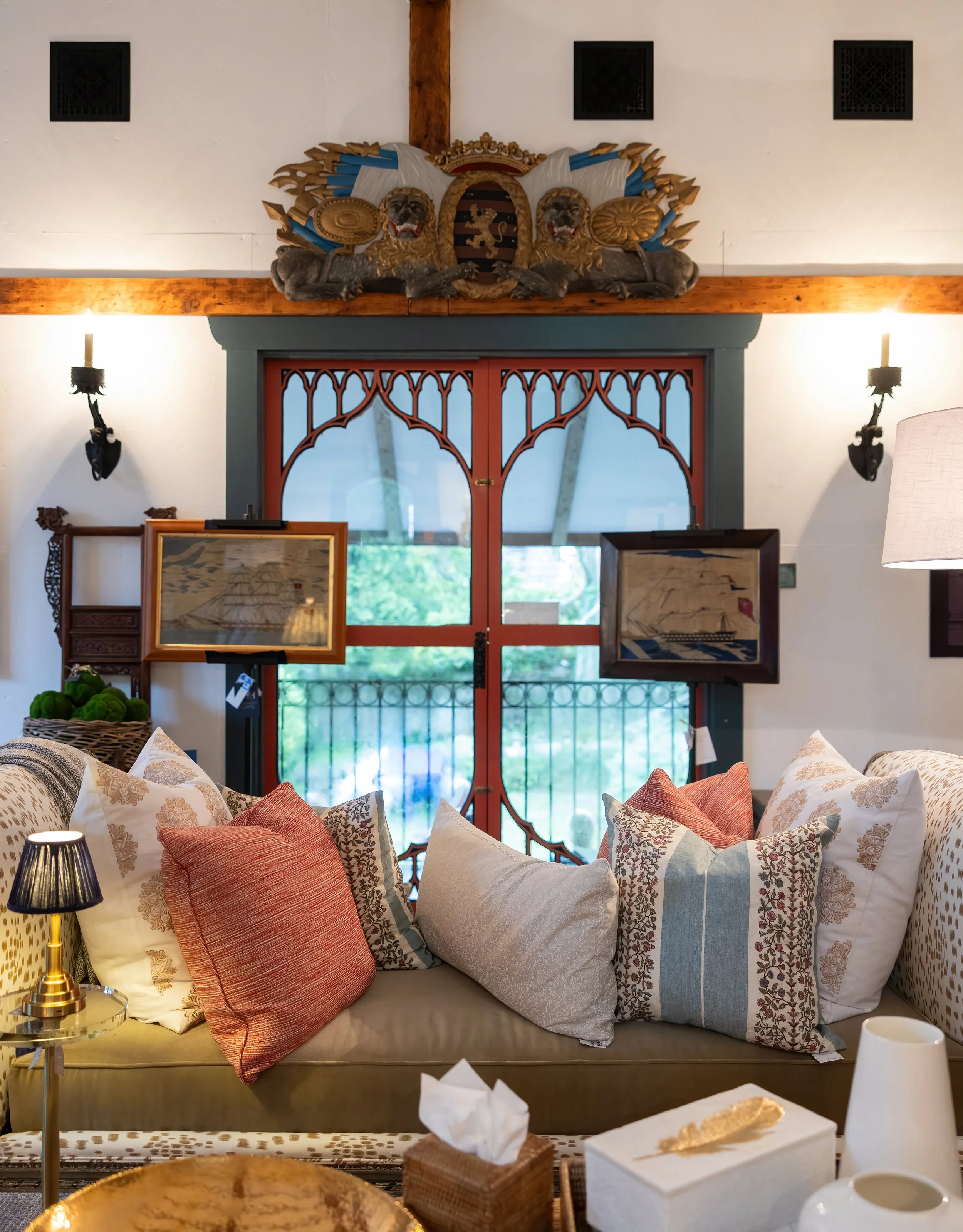 Greater Light was originally built around 1790 and used as a livestock barn until sisters, Gertrude and Hanna Monaghan discovered the building in 1929 and transformed it into their summer retreat. As a sponsor of Nantucket by Design, we were asked to recreate the space for a Work/Shop event as if the sisters were living there today. We blended art and whimsy with an appreciation of the handcrafted – whether woven, carved, forged, or painted – to create a strongly expressive environment that we believe would be well suited to their tastes.